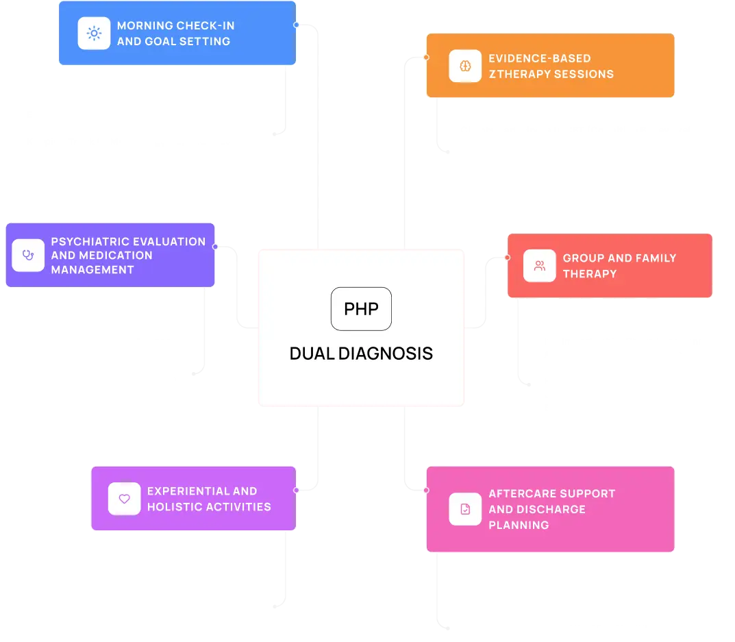 These conditions make each other worse, and if you don’t treat both, you’re vulnerable to relapse. Our PHP for Dual Diagnosis takes care of both parts at the same time with an integrated approach.
